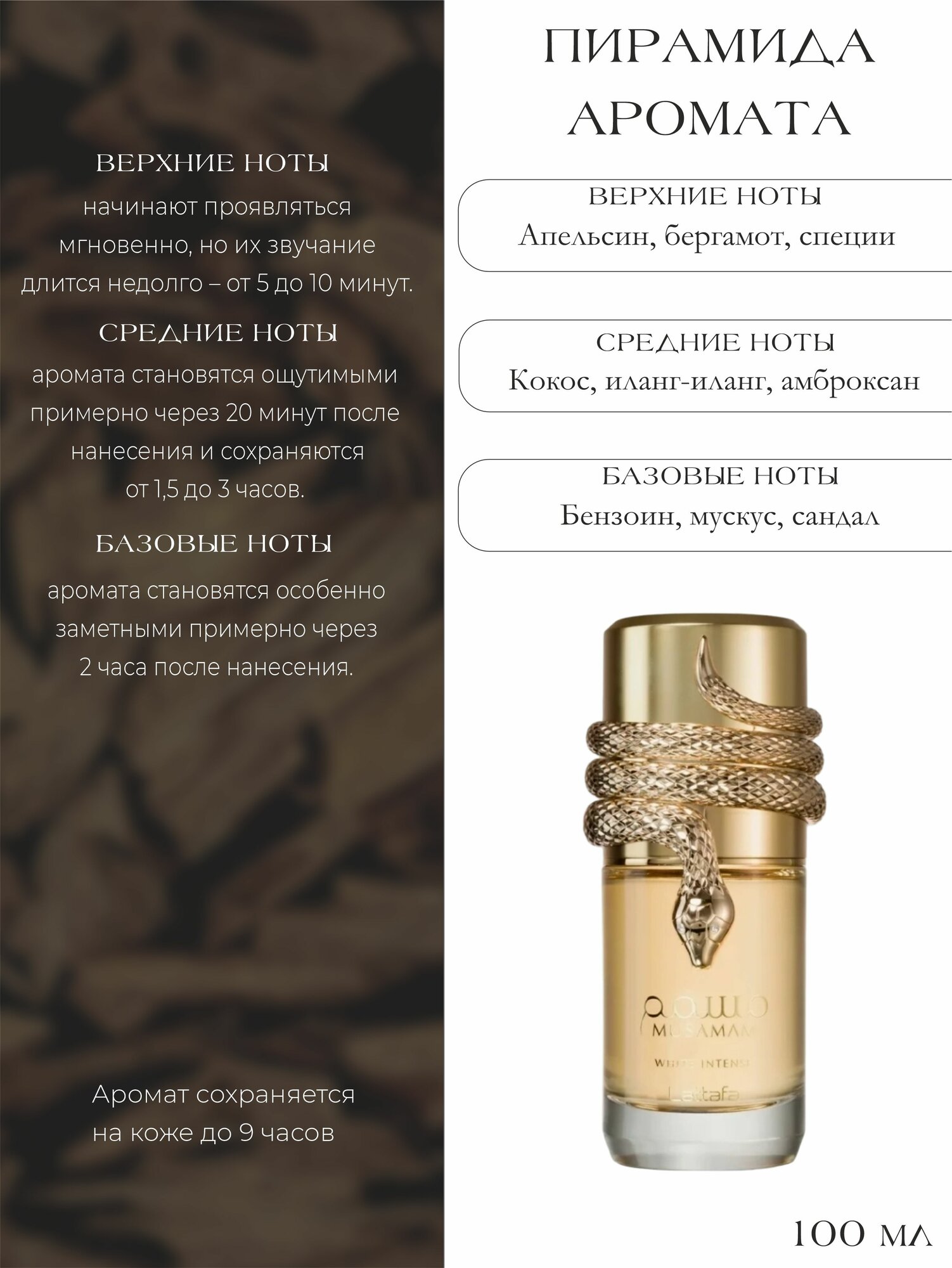 Парфюмерная вода Lattafa Musamam White Intense объемом 100 мл — это великолепное произведение искусства в мире ароматов, которое пленяет своей сложной композицией и неповторимым характером. Идеально подходит как для повседневного использования, так и для особых случаев. Этот парфюм создает уникальную атмосферу, оставляя за собой шлейф загадочности и уверенности. С первых аккордов вы ощутите свежие верхние ноты, в которых прекрасно сочетаются апельсин и бергамот, создавая яркий и бодрящий старт для вашего ароматного путешествия. Затем к вам приоткроются ноты сердца: загадочный амброксан, нежный иланг-иланг и экзотический кокос добавляют сладость и теплоту, что делает аромат по-настоящему уникальным и запоминающимся. Завершающие базовые ноты — это гармония бензоина, мускуса и сандалового дерева, которые придают парфюму глубину и стойкость. Эти составляющие создают теплоту и уют, идеально подчеркивая ваш индивидуальный стиль и делая этот аромат неотъемлемой частью вашего образа. Lattafa Musamam White Intense — это не просто духи, это ваше настроение, ваша история и ваш личный штрих, который вы оставляете в памяти окружающих. Подарите себе и своим близким этот невероятный аромат, который станет вашим верным спутником в любых жизненных моментах.