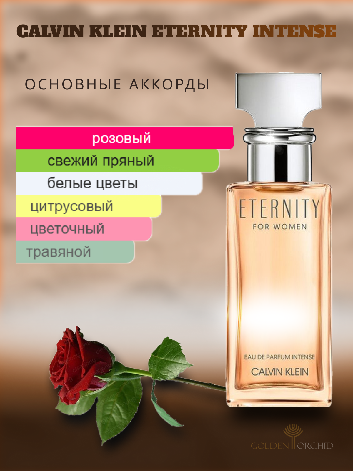 | Ноты | Корень ириса, Водные ноты, Бергамот, Ирис, Османтус, Роза, Ваниль, Мускус, Сандал |