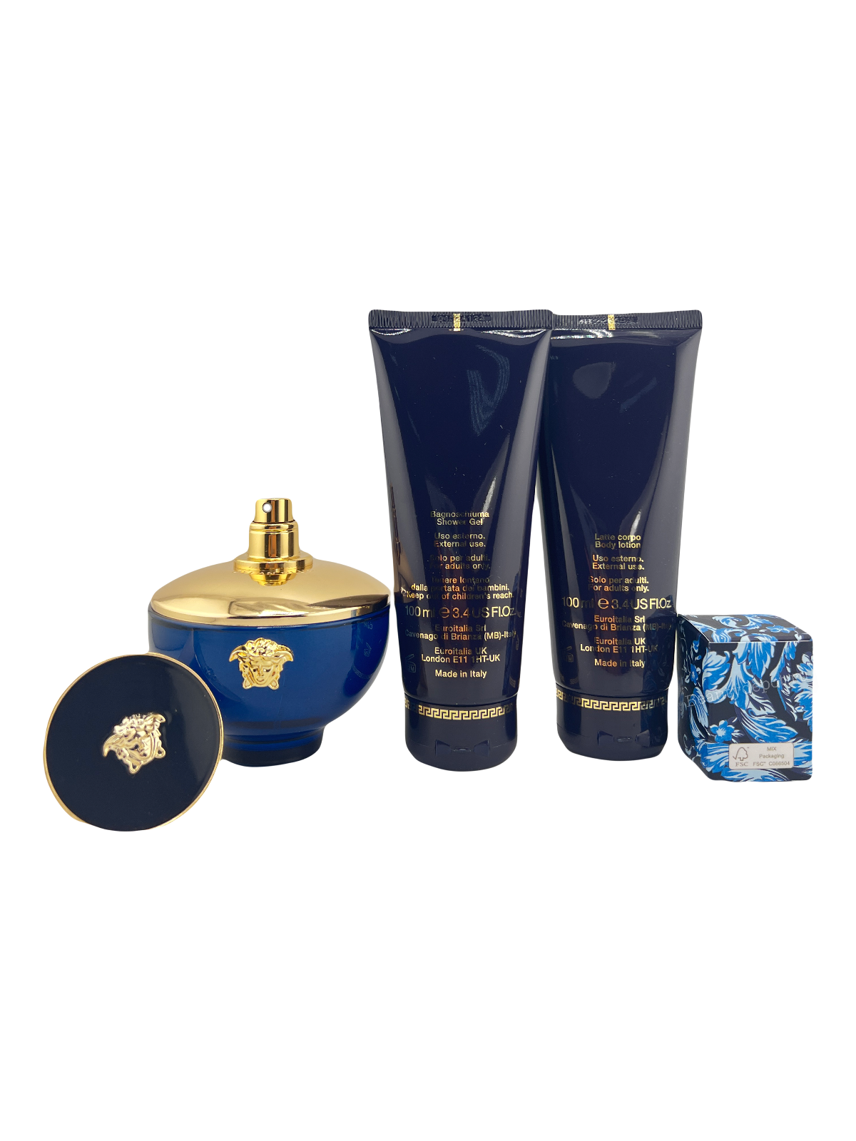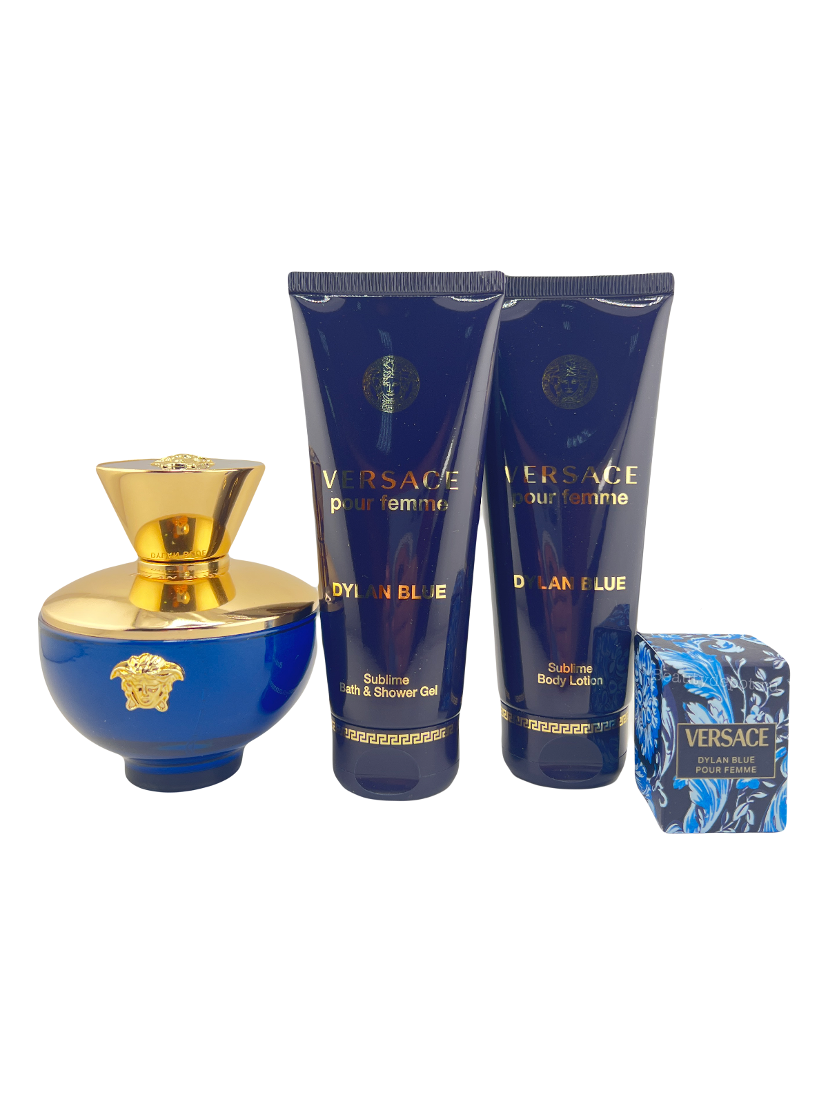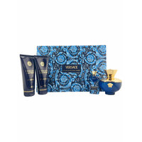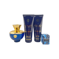 Подарочный набор Dylan Blue Pour Femme Set состоит из четырех продуктов. Парфюмерной воды, геля для душа, лосьона для тела и миниатюры парфюмерной воды.