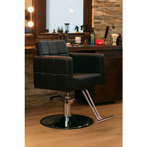 Стильное и функциональное парикмахерское кресло JB1005 в интересном дизайне предлагает простоту и удобство для работы мастера. Обтянуто черной матовой экокожей, оно добавляет элегантности и современности в интерьер салона.