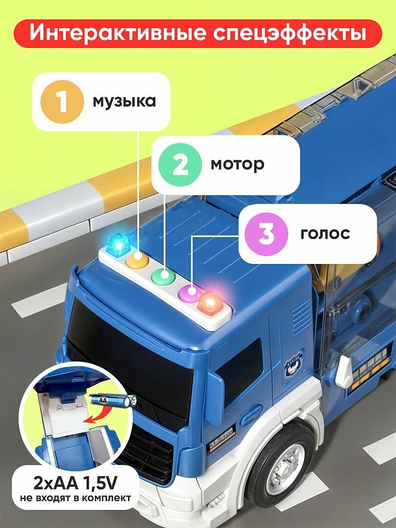 Серия игрушечных автотреков с машинками Мега-Паркинг с музыкой "Полицейские гонки 3 в 1" - это интересная и развивающая игра, которая направлена на всестороннее развитие ребенка. Машинка-трансформер - это самая любимая игрушка мальчишек. Большой автовоз изготовлен из безопасного пластика без посторонних запахов. Машина легко превращается в автогорки, а это еще больше увлекает в игровой процесс. Спецтехника для перевозки должна что-то перевозить, поэтому в комплекте есть 6 маленьких автомобилей разных моделей и цветов (желтая, синяя и голубая, зеленая, белая и красная), которыми можно играть, как отдельными мини машинками. Еще в комплекте реалистичные знаки и настоящие наклейки чтобы придумывать свои правила для атмосферы игры. При помощи цветных наклеек мальчишки украсят свой трансформер и все детали модельки. Наличие многочисленных деталей развивает мелкую моторику рук, мышление, фантазию, воображение и координацию ребенка. Музыкальный многоуровневый автотрек Полиция не просто детская автопарковка для машин или популярный гоночный трек гибкий - трасса, а целый мультипарк площадка - интерактивная развивающая игрушка спираль, которая увлечет с головой как мальчиков, так и девочек. У грузовой машины откидывается назад кабина, открываются двери, на крыше кабины расположены световые индикаторы - светящиеся полицейские мигалки сирена и кнопки для звуковых эффектов. Игрушечный транспорт работает от двух батареек АА (в комплект развлечения не входят). Интересный гараж легко собирается, детали надежно стыкуются между собой. Двусторонний паркинг детский изготовлен из качественного безопасного для здоровья пластика, а форма дороги грузовика с прицепом и автомобильных аксессуаров не имеет острых углов. С таким игровым комплексом игры проходят самостоятельно или в компании с братьями и сестрами, друзьями и родителями, забывая про планшет, телефон и др гаджеты. Крутые спуски и подъемы на которых тачки, соревнуясь друг с другом, смогут устраивать скоростные гонки. Для придания большей скорости авто с горки катапульта производит запуск одним нажатием. Трейлер автопарк стоянка идеально подойдет для игры на улице для песочницы или дома. Представьте только сколько счастья будет у вашего любимого ребенка, когда получит такой необычный оригинальный подарок на день рождения в честь 4 годика, 5, 6 и 7. Или 8, 9 лет. Сыну на новый год или 23 февраля на 10 или 11 лет и др, а может быть просто так маленький сюрприз без повода или под любой другой праздник для мальчиков. Детки обязательно захотят взять данные товары с собой в садик и школу. Товар для малышей подходит для детей от 3 лет и старше. Удобная подарочная упаковка позволяет взять данный тягач с собой в дорогу. Развлекайтесь, устраивайте ролевые игры и учитесь с нашим набором машинок!