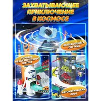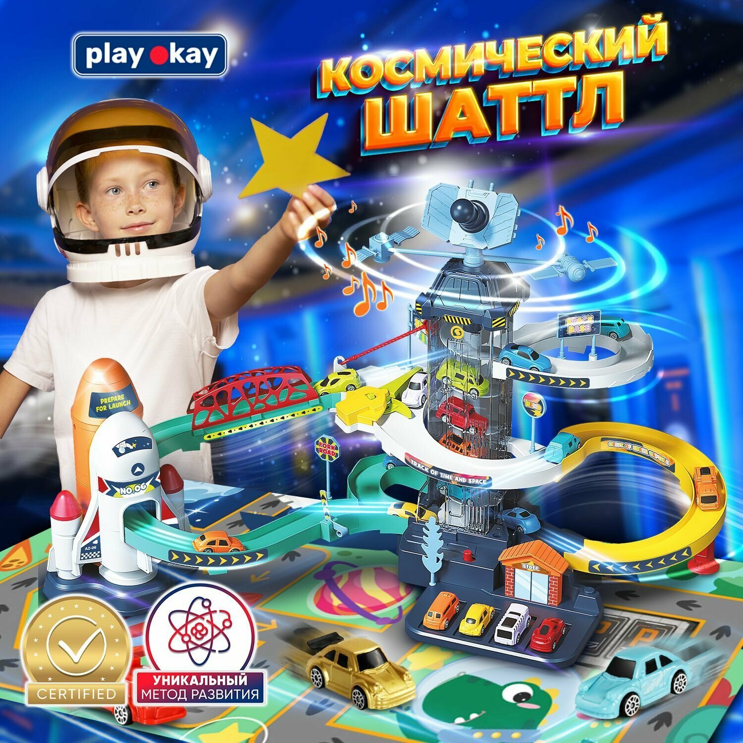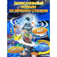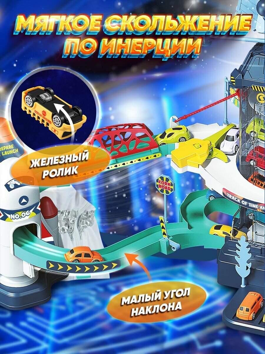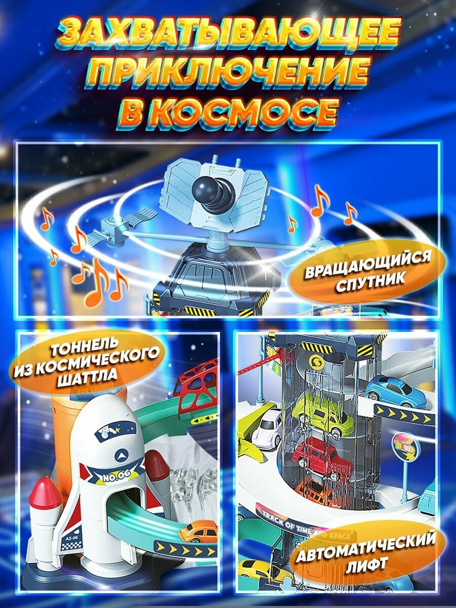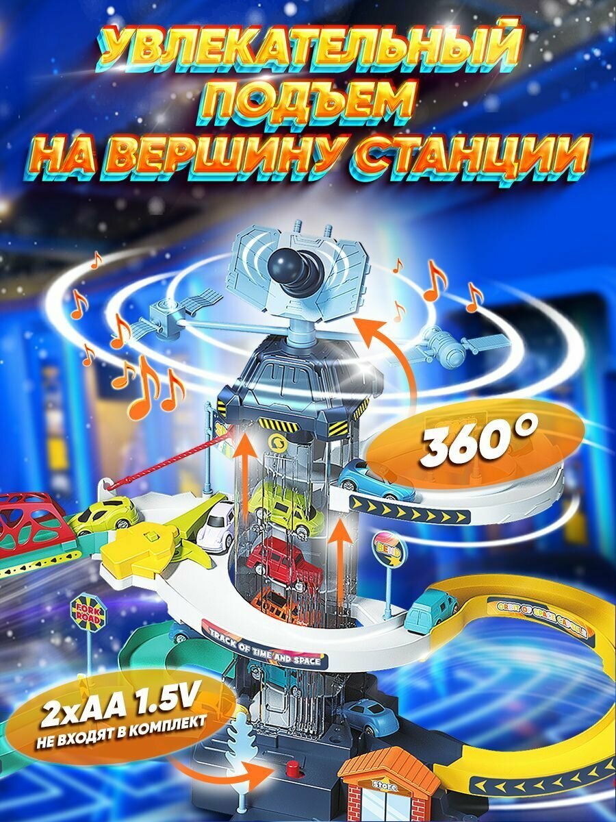 Серия игрушечных автотреков с машинками Мега-Паркинг с музыкой - это интересная и развивающая игра, которая направлена на всестороннее развитие ребенка. Маленький набор повышает работоспособность мозга, тренирует зрительно-моторную координацию, развивает воображение и фантазию. Набор представляет собой игровую модель орбитальной станции. Перед ребенком предстает целый игровой комплекс с разноуровневой трассой и электрическим лифтом с подсветкой. Светящийся электролифт представляет из себя огромную антенну со спутниками, а по трассе спешат разноцветные машинки, их движение автоматическое, ребенок только решает поедет машинка на новый круг или отправит ее на съезд, перекрыв трассу. Музыкальный многоуровневый автотрек не просто детская автопарковка для машин или гоночный трек гибкий, а целый мультипарк площадка - интерактивная развивающая игрушка спираль, которая увлечет с головой как мальчиков, так и девочек. Постройте орбитальную станцию с вращающимися радарами и летающими ракетами, быстрыми машинками, направление движения которых можно регулировать с помощью рычагов и шлагбаумов. Конструктор легко собирается, детали надежно стыкуются между собой. Паркинг детский изготовлен из качественного безопасного для здоровья пластика, а форма дороги и автомобильных аксессуаров не имеет острых углов. Космос не оставляет равнодушным ни детей, ни даже взрослых! С таким игровым комплексом игры проходят самостоятельно или в компании с братьями и сестрами, друзьями и родителями, забывая про планшет и телефон. Крутые спуски и подъемы на которых тачки, соревнуясь друг с другом, смогут устраивать скоростные гонки. Игрушечная парковка для машинок включает в себя игровой набор из множества элементов: лифт с автоматическим или ручным подъемом и светом, который поднимает вверх 4 разноцветные машинки, извилистый гоночный трек, тоннель через космические ракеты, мост, гараж для машинок и паркинг, а также вращающийся космический радар! Транспорт с встроенным центральным металлическим инерционным колесиком под днищем, и специальнлй выемкой для зацепа подъемника. Соберите свой невероятный космический мультипарк с ракетами и динозаврами, соединив автотрек с эскалатором "Динозавры в космосе" с парковкой с лифтом "Космический шатл". Процесс сборки горки увлекателен с первых минут, ребенок почувствует себя настоящим строителем орбитальной станции. Это крутой недорогой подарок для детей на любой праздник: будь то день рождения или новый год, 1 сентября, 8 марта или 23 февраля для любимого крестника, племянника, внука и внучки