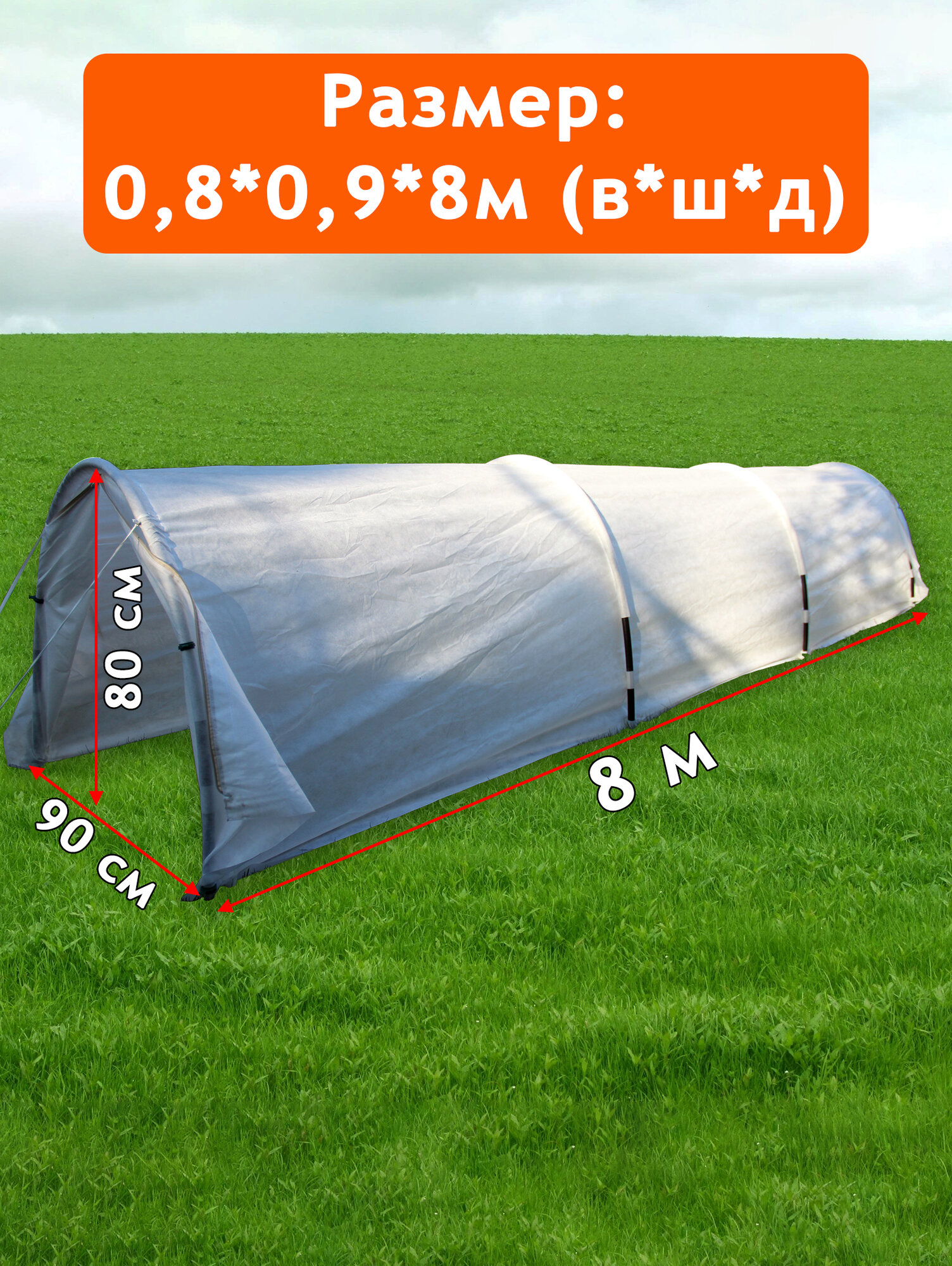 Размеры парника в установленном виде: длина - 8 м, высота - 80 см, ширина - 90 см.