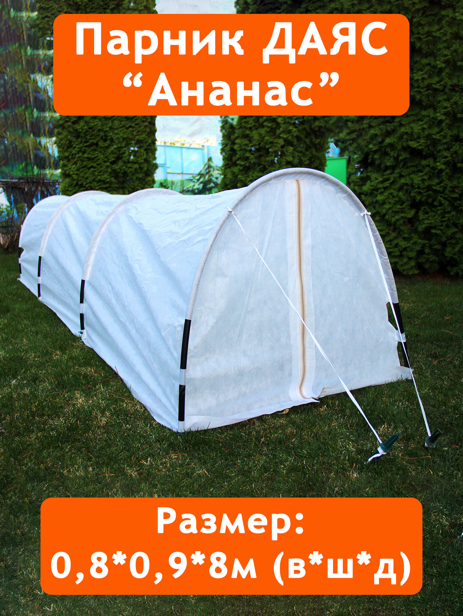 Установить парник Даяс "Ананас очень легко - дуги уже вставлены в специально пришитые к чехлу рукава, секции раздвигаются гармошкой, ножками устанавливается в грунт, с торцов он натягивается. Просто и легко. А чтобы полить или прополоть достаточно сдвинуть материал чехла вдоль дуг вверх и прикрепить там его клипсой, которая есть в комплекте. После работ опять спустить материал вниз вдоль дуг. Не надо мучиться и снимать весь материал и потом натягивать его снова. Очень удобно.