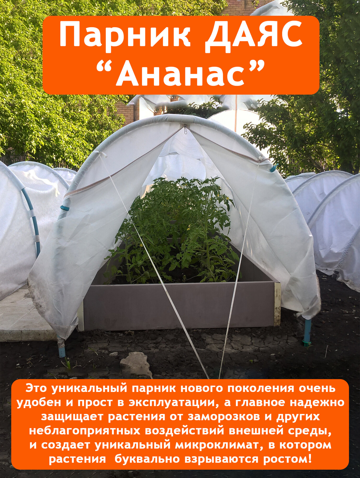 Парник Даяс "Ананас" - это уникальный парник нового поколения очень удобен и прост в эксплуатации, а главное надежно защищает растения от заморозков и других неблагоприятных воздействий внешней среды, и создает уникальный микроклимат, в котором растения буквально взрываются ростом!