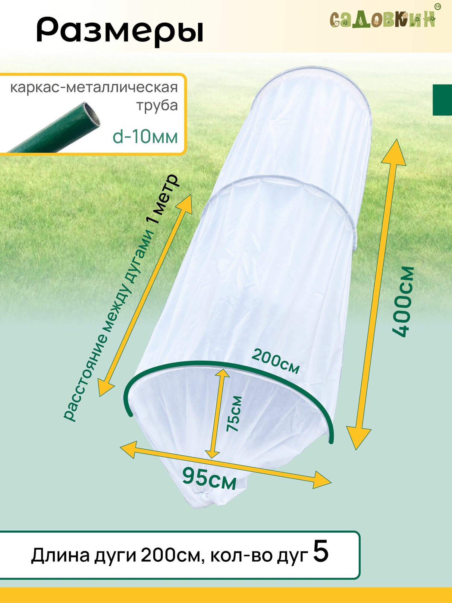 Парник дачный "Люкс". Дуги металлические 2х4м. Чехол из усиленного материала спанбонд 60г/m2 с УФ защитой. Каналы для металлических дуг сделаны методом спайки материала что делает их очень долговечными, такие канылы не разойдутся. Парник предназначен для выращивания различных культур в открытом грунте. Металлические дуги с ПВХ покрытием разгибаются, приобретая нужную форму, устойчивы к воздействию внешней агрессивной среды. Легкий дышащий нетканный материал обеспечивает надежную защиту растений. Создает стабильный микроклимат. Защищает от холодных ветров, промерзаний, резких перепадов температур и прямых солнечных лучей.