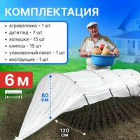 Парник из дуг с прошитым укрывным материалом для дачи Подснежник. Длина 6 м, ширина 120 см, высота 80 см. В комплектацию парника 6 м входят: Агроволокно плотностью 42 г/м2 - 1 шт; дуги ПНД (диаметр 20 мм) - 7 шт; колышки (длина 26 см, 6 см вставляются в дугу) - 15 шт; клипсы (диаметр 20 мм) - 15 шт; упаковочный пакет - 1 шт; инструкция - 1 шт.