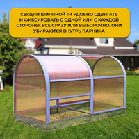 | Комплектация | Каркас, поликарбонат на торцы, поликарбонат на секции, ручки пластиковые, направляющие пластиковые, грядки оцинкованные, метизы, инструкция. |