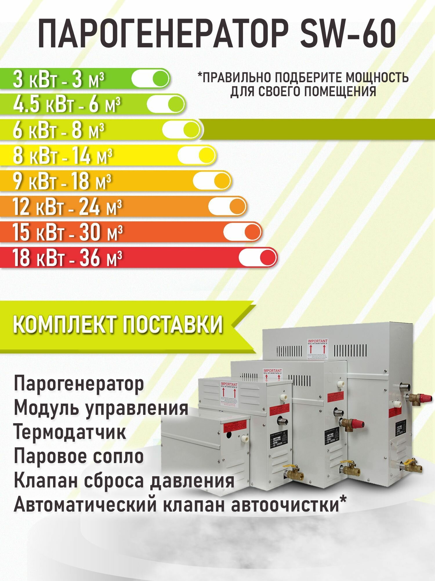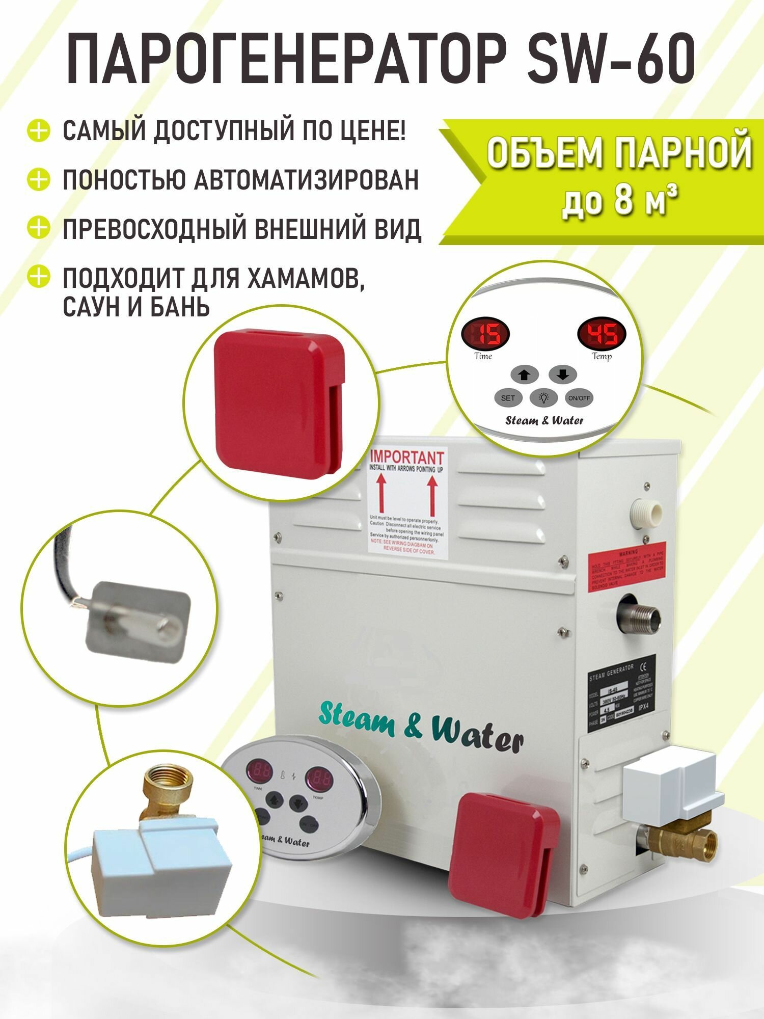 Купить Парогенератор для бани, хамам, турецкой бани Steam & Water AVTO — 60 (6 кВт). Автоматический дренаж с доставкой по всей России.