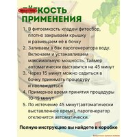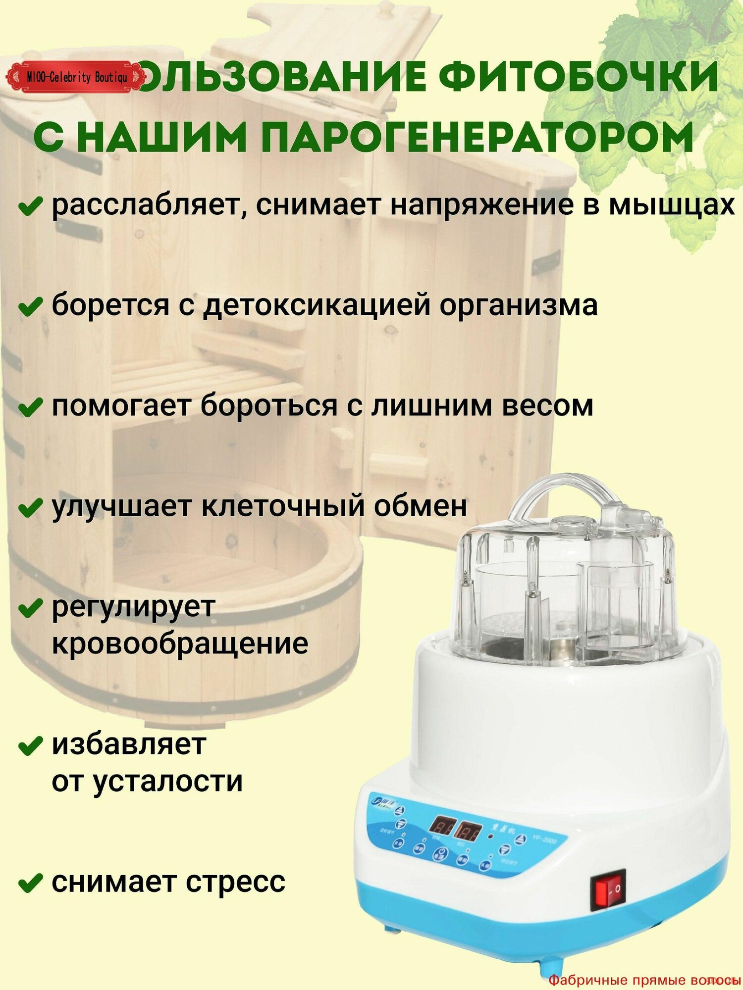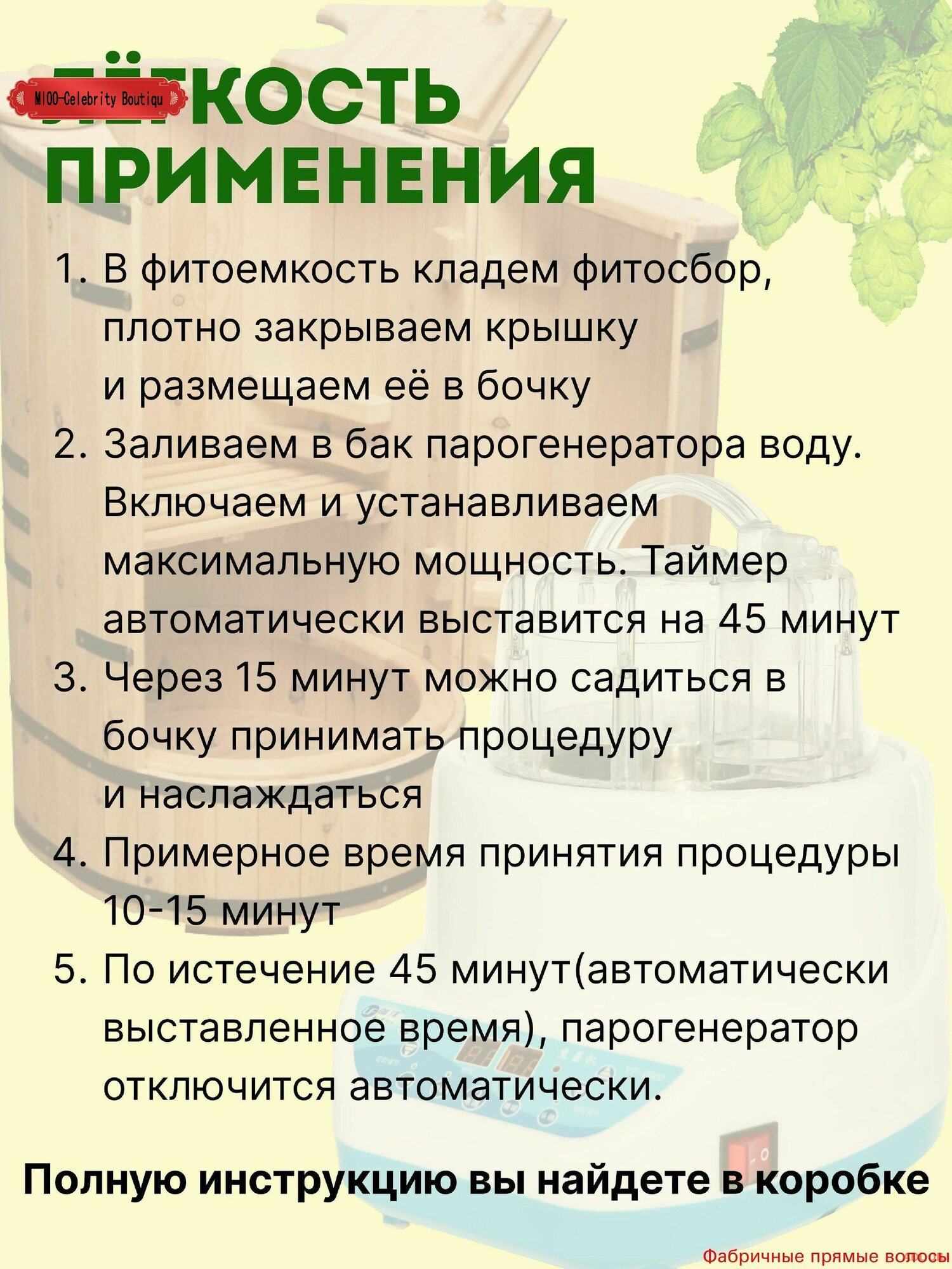 Парогенератор накопительного типа с цифровым табло, с объемом бака 4 литра, подходит для небольшой кедровой бочки (фитобочки). В комплекте также предусмотрен пульт дистанционного управления и таймер времени. Благодаря компактным размерам и простым функциям, испаритель для сауны и бани очень удобен. Его использование рекомендуется как для частного, так и для коммерческого использования. Способ применения: Размещаем фитоемкость в бочку, ставим ее в тарелочку с краями, чтобы конденсат не оседал на дне бочки, а собирался в одном месте, для удобства дальнейшего его удаления. В фитоемкость кладем фитосбор и плотно закрываем крышку, заливаем в бак парогенератора воду, не более 3,8л. Включаем парогенератор. Устанавливаем максимальную мощность (16), она при полном нагреве будет равна 48-50°С. Устанавливаем таймер на 30 минут, либо он автоматически выставится на 45 минут (по желанию, можно изменить установленное время или преждевременно выключить парогенератор), через 15 минут можно садиться в бочку и принимать процедуру. Примерное время принятия процедуры 10-15 минут. По истечении 45 минут(автоматически выставленное время), парогенератор отключится автоматически. Мощность: 2000Вт Объем: 4л. Фитоемкость Дистанционное (пульт) и ручное управление: регулировка мощности регулировка времени- Бак: нержавеющая сталь- Время выхода в режим пара: 5 мин.- Количество сеансов на одну заправку: 2- Звуковой датчик защиты от перегрева- Визуальный уровень воды в баке. WUYOUHAITAO