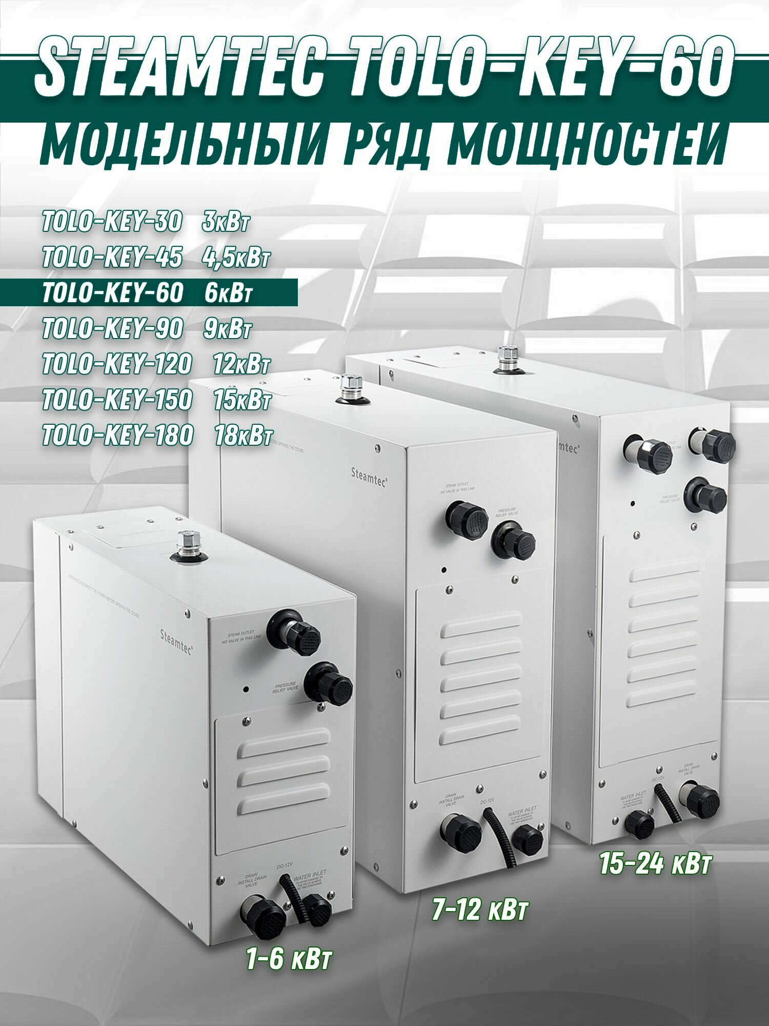 Парогенератор для хамама и турецкой бани Steamtec TOLO-60-KEY (6 Квт), 220В (объем парной 5-7 м3) - влагостойкий модуль управления