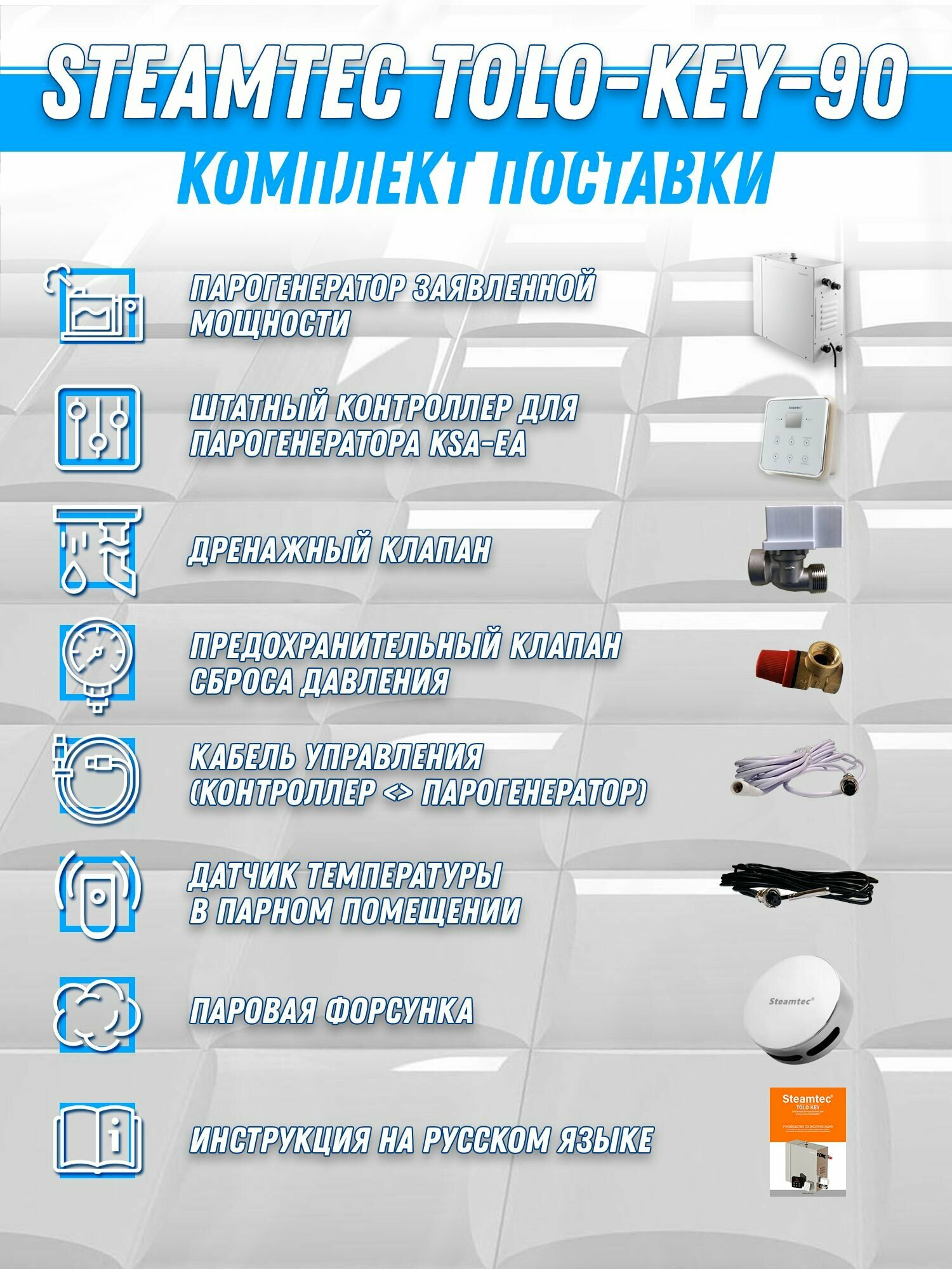 Парогенератор Steamtec TOLO-90-KEY (9 Квт), 380В (объем парной 9-11 м3) Автоматический дренаж: сравнение цен, характеристики, фото, актуальное наличие и цены.