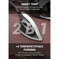2в1: режим Smart Temp — поддержание оптимальной температуры подошвы + 4 температурных режима для профессионального ухода за каждым типом ткани. Технология равномерного распределения тепла по подошве SMART HEAT.