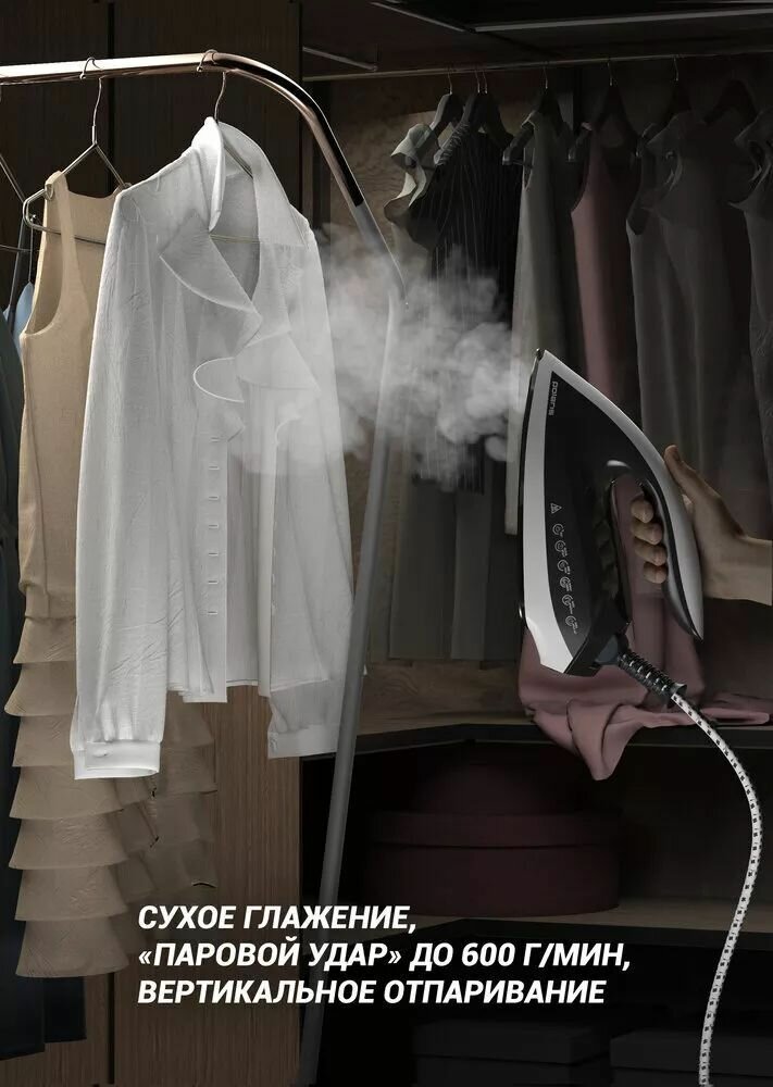 подошва: PRO 5 Ceramic; время подготовки к работе: 30 секунд; отключение при перегреве; автоотключение после 10 минут в режиме ожидания; сухое глажение