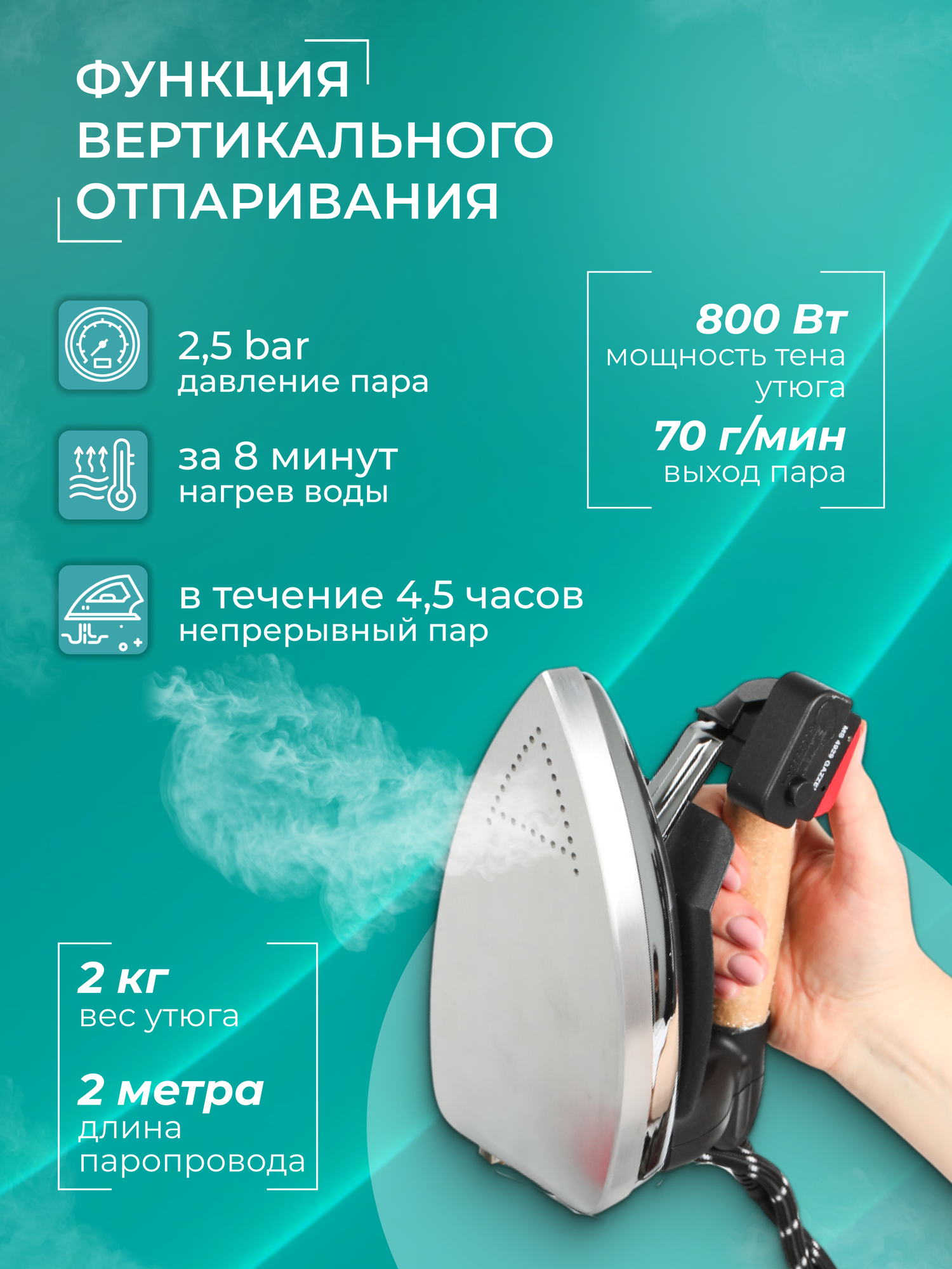 Парогенератор оснащен автоматическим отключением при недостаче воды и имеет 4 уровня защиты от перегрева. Это обеспечивает безопасность использования и продлевает срок службы устройства.