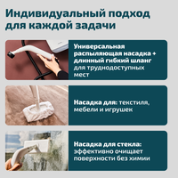 Устройство оснащено вертикальным и горизонтальным отпариванием, что позволяет очищать ковры, стекла и мебель. В комплекте идут различные насадки и щетки, что делает пароочиститель многофункциональным и удобным в использовании.
