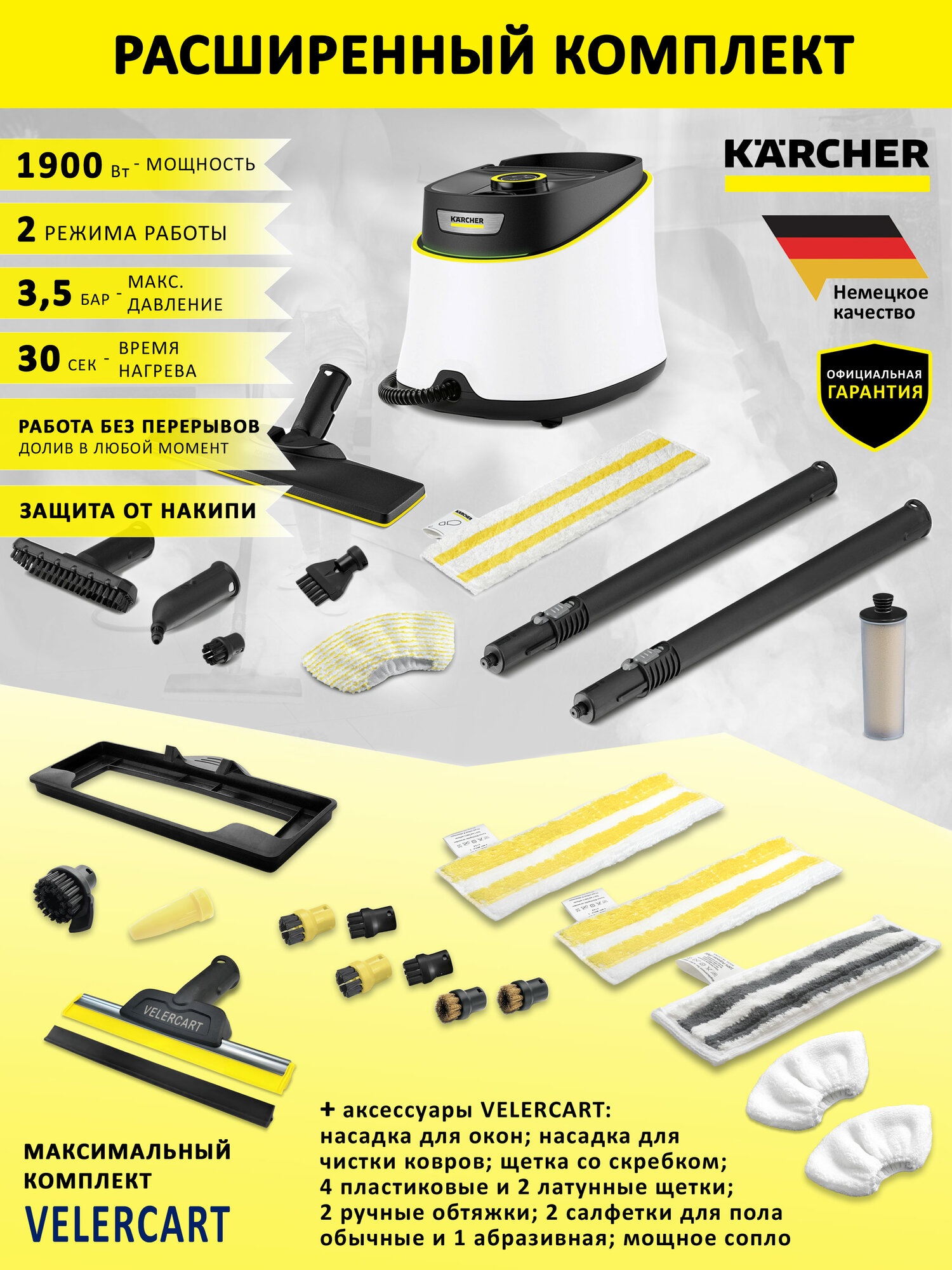Пароочиститель Karcher SC 3 Deluxe EasyFix, белый + аксессуары VELERCART в комплектации MAX: сравнение цен, характеристики, фото, актуальное наличие и цены.