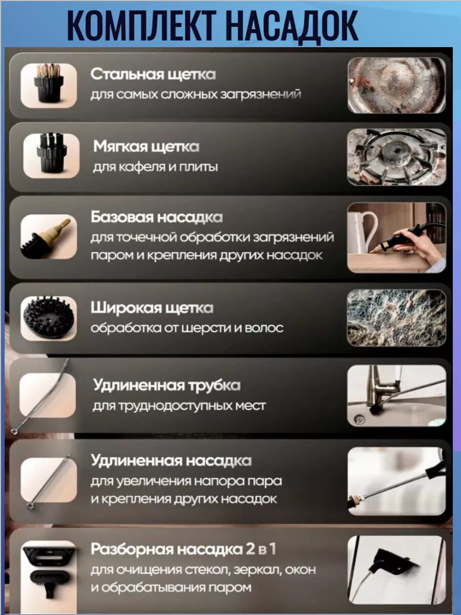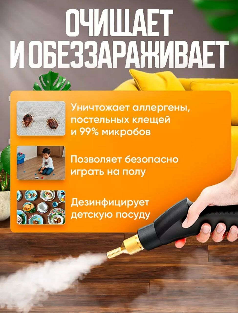 Пришло время избавиться от многочисленных загрязнений на поверхностях вашего жилья? Наш новый пароочиститель - эффективное и незаменимое устройство, которое поможет вам справиться с любыми проблемами по уборке. Сочетая в себе силу высокотемпературного мощного пара, наша бытовая техника для дома обеспечивает безупречный результат без каких-либо химических средств, вызывающих аллергические реакции. Очиститель паром - многофункциональный и безопасный для вашего здоровья и окружающей среды. Пользуясь нашим прибором, вы сумеете убрать все - от пыли и грязи до жирных пятен и бактерий. Независимо от любой плоскости- ковров, плитки, стекла или мебели - наш универсальный парогенератор отлично управится со всеми грязными следами. Он не только отличный жироочиститель для кухни, но и дезинфицирует, уничтожая вредные микроорганизмы. Для вашего удобства наш паровой очиститель оборудован широким ассортиментом насадок и настройками, позволяющими настроить его под ваши индивидуальные потребности. Бонусная насадка для окон. Вы сможете выбрать мощность пара в зависимости от сложности задачи, а специальные перчатки помогут вам достичь лучших результатов в любом месте. Бак объемом 1200 мл позволяет продолжительное время работать с многофункциональным устройством без перезаправки. Так что не откладывайте! Приобретите наш пароочиститель высокого давления прямо сейчас и уберите свою квартиру как никогда прежде. Наслаждайтесь безупречной чистотой в вашем доме с нашим универсальным пароочистителем.