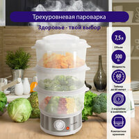 Особенностью данной модели является трехуровневая конструкция, что позволяет готовить на пару различные продукты и блюда. Это помогает свести к минимуму уровень холестерина в продуктах, приготовленных посредством жарки, и сохранить питательные вещества овощей, мяса, птицы и рыбы.