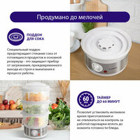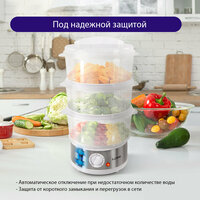 Пароварка оснащена механическим управлением, что делает процесс приготовления пищи на пару максимально простым и удобным. Функция таймера позволяет установить желаемое время приготовления продуктов до 60 минут, а надежная система защиты прибора исключает возможность опасных ситуаций, связанных с недостатком воды.