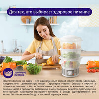 Корпус пароварки выполнен из нержавеющей стали, что обеспечивает его долговечность и защиту от внешних воздействий. Материал паровых корзин – прозрачный пластик, что позволяет наблюдать за процессом приготовления пищи.