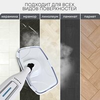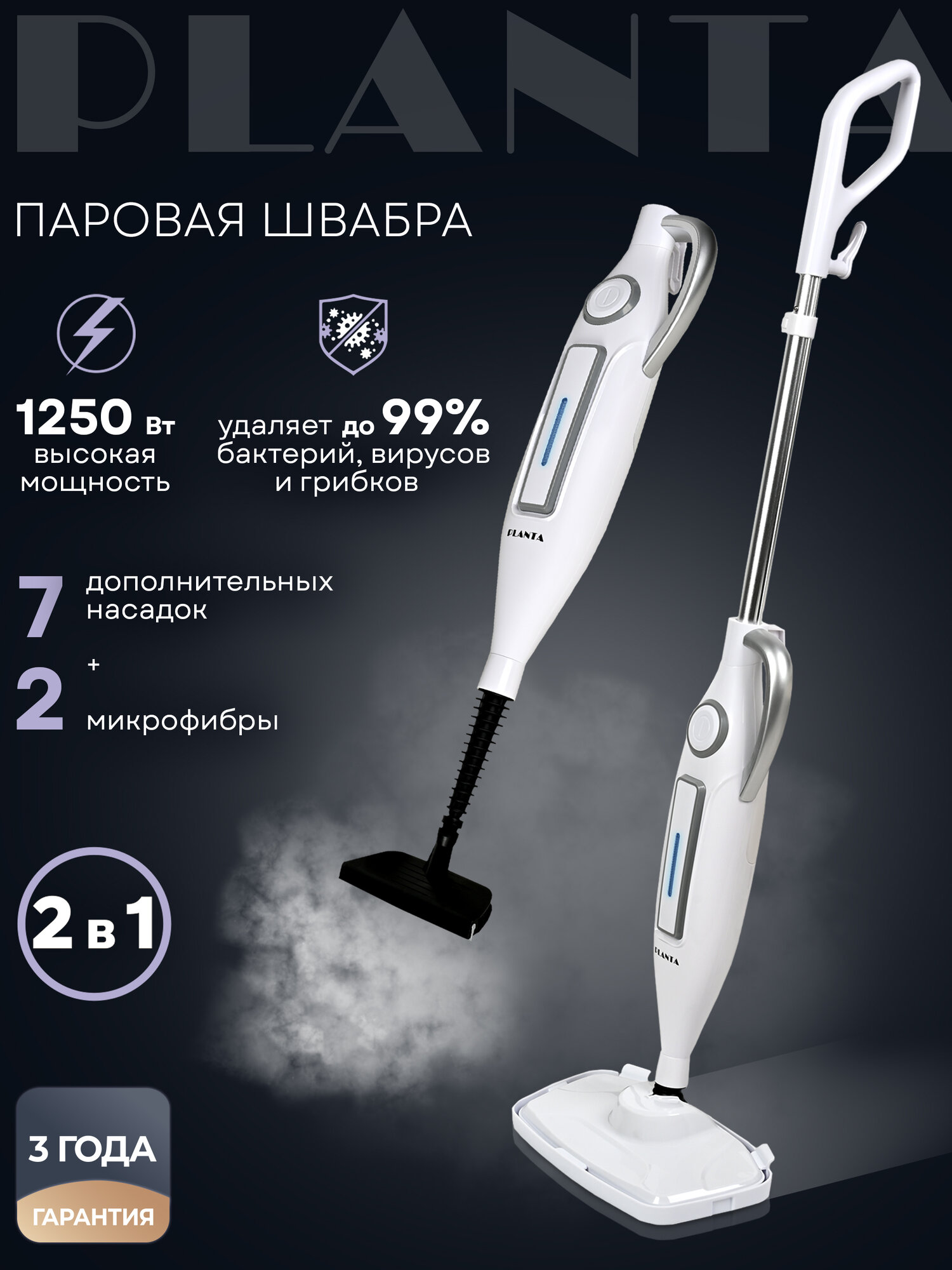Паровая швабра PLANTA PL-SM03 создана для тех, кто ценит в доме уют, чистоту и комфорт, а также следит за своим здоровьем и здоровьем своих близких. Паровая швабра для мытья полов эффективно борется с вирусами, бактериями, плесенью, грибками и загрязнениями различного вида без использования моющих химических средств. Паровая швабра и пароочиститель PL-SM03 с высокой мощностью 1250 Вт и резервуаром для воды 330 мл – это идеальное решение для тех, у кого дома живут аллергики, дети и домашние животные. Швабра для мытья полов PL-SM03 подходит не только для уборки пола, но и для уборки всей квартиры. 7 дополнительных насадок, входящих в комплект, позволят Вам довести до идеальной чистоты кухню, ванную комнату, окна и зеркала, а также любые поверхности и труднодоступные места. Паровая швабра с насадками легко преобразуется в ручной пароочиститель. Благодаря специальной насадке для ковров, паровая швабра с насадками для уборки дома PL-SM03 также подходит и для чистки ковров. Пар убивает пылевых клещей, устраняет загрязнения и неприятные запахи. Паровая швабра с насадками для уборки может быть использована для любых поверхностей: ламината, паркета, кафеля, линолеума и так далее. Помимо этого паровая швабра и пароочиститель с насадками можно использовать для отпаривания штор, мягкой мебели, игрушек или фурнитуры, а также для мытья окон. Швабра паровая с насадками поставляется в комплекте с двумя микрофибрами, которые можно стирать ручной и машинной стиркой в деликатном режиме. Электрошвабра заключена в удобный и компактный корпус, она не занимает много места в доме и за счет лаконичного внешнего вида впишется в любой интерьер. Швабра паровая PLANTA PL-SM03 создана для того, чтобы облегчить Ваши хлопоты по дому, сделав процесс уборки простым и занимательным!