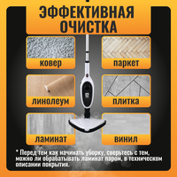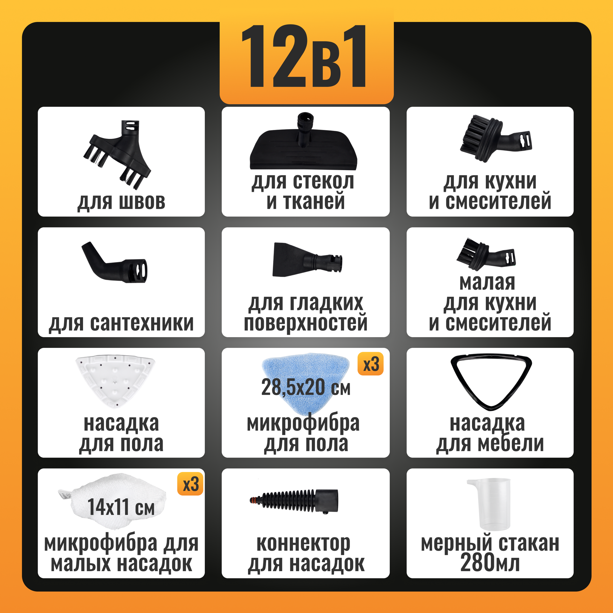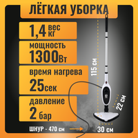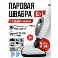 Представляем вам умную многофункциональную электрическую паровую швабру от нашего бренда. Это современный бытовой помощник для женщин и мужчин, подходящий для домашней уборки и профессионального клининга. Модель имеет прочный пластиковый корпус из ПВХ. Она оборудована резервуаром для воды емкостью 280 мл и удобной длинной ручкой. Приспособление поставляется в комплекте со сменными запасными насадками и тряпками из мягкой микрофибры (3 синих и 3 белых салфетки). Благодаря обработке горячим паром швабра обеспечивает антибактериальный и противовирусный эффект. Это отличный выбор для горизонтального мытья напольных покрытий или вертикальной уборки стен и потолка. Угловая форма насадки позволяет вымывать уголки и труднодоступные места за мебелью. Универсальная парошвабра станет отличным выбором для мытья полов из кафеля, плитки и керамогранита, очистит паркет, ламинат и кварцвинил. Микрофибровые салфетки не оставят разводов на стеклянных поверхностях. Моющая швабра поможет очистить паркетную доску, оконные стекла или кафельную плитку. Прибор с набором насадок и опцией генерации пара станет отличным выбором для уборки дома или квартиры. Устройство поможет навести чистоту в гостиной, спальне или детской ребенка, других жилых комнатах, прибрать санузел или кухню, коридор. Швабра с удобной рукояткой имеет насадки для уборки ковров, дивана и матраса, для ухода за кухонной раковиной, мойкой и другой сантехникой, насадку для швов и гладких поверхностей. Она поможет минимизировать риск возникновения аллергии у взрослого человека и малыша. Подключается к сети с помощью шнура. Модель без труда очистит не только пол, но и настенные наличники, шторку или ковер, многое другое. Благодаря пару она справится не только с пылью или грязью, но и с жиром или стойкими загрязнениями. Устройство поставляется в фирменной коробке с набором насадок, салфеток и подробным мануалом. У нас есть акции и распродажи, вы можете купить наши товары в подарок со скидкой!
