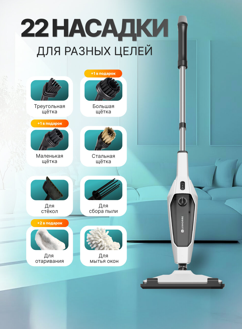 Купить Паровая швабра с насадками LUXHOMME EcoSteam Pro 7 в 1, электрошвабра 1400 ватт, подача пара 25-30 г/мин, объём 400 мл. с доставкой по всей России.