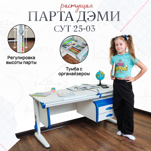 Парта растущая дэми СУТ-25-03 с тумбой, размер 120х55х81,5 см цвет ЛДСП белая, накладки синие, ноги белые: сравнение цен, характеристики, фото, актуальное наличие и цены.
