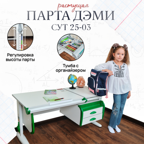 Парта растущая дэми СУТ-25-03 с тумбой, размер 120х55х81,5 см цвет ЛДСП белая, накладки зеленые, ноги белые: сравнение цен, характеристики, фото, актуальное наличие и цены.