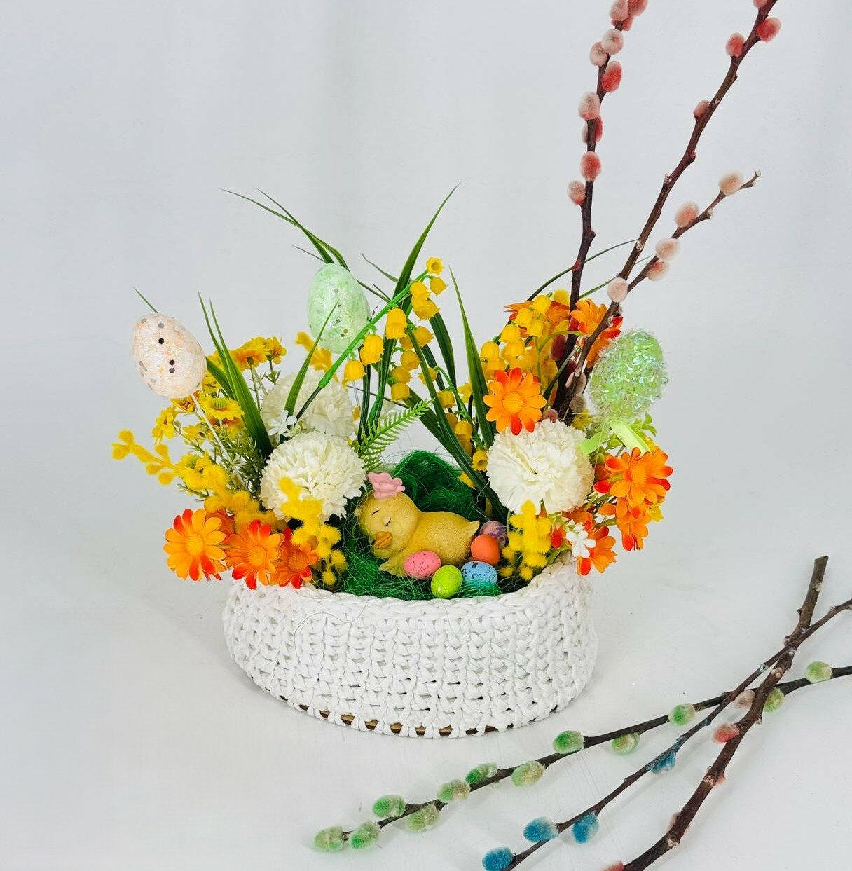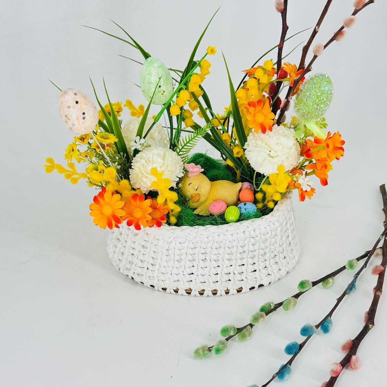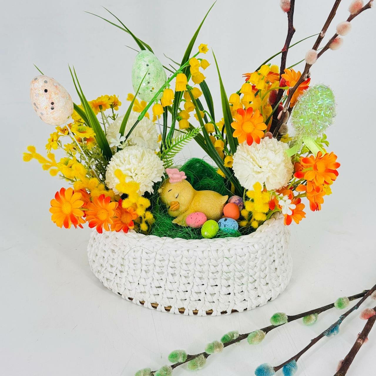 Купить Пасхальная композиция из искусственных цветов с веточками вербы в плетёном кашпо с сувениром цыплёнок с доставкой по всей России. Пасхальная композиция из искусственных цветов с веточками вербы в плетёном кашпо с сувениром цыплёнок: сравнение цен, характеристики, фото, актуальное наличие и цены.