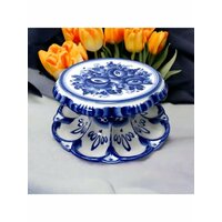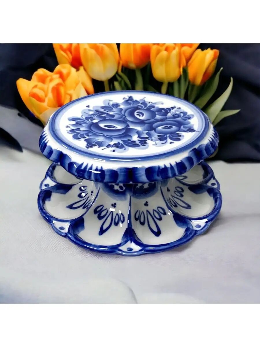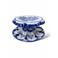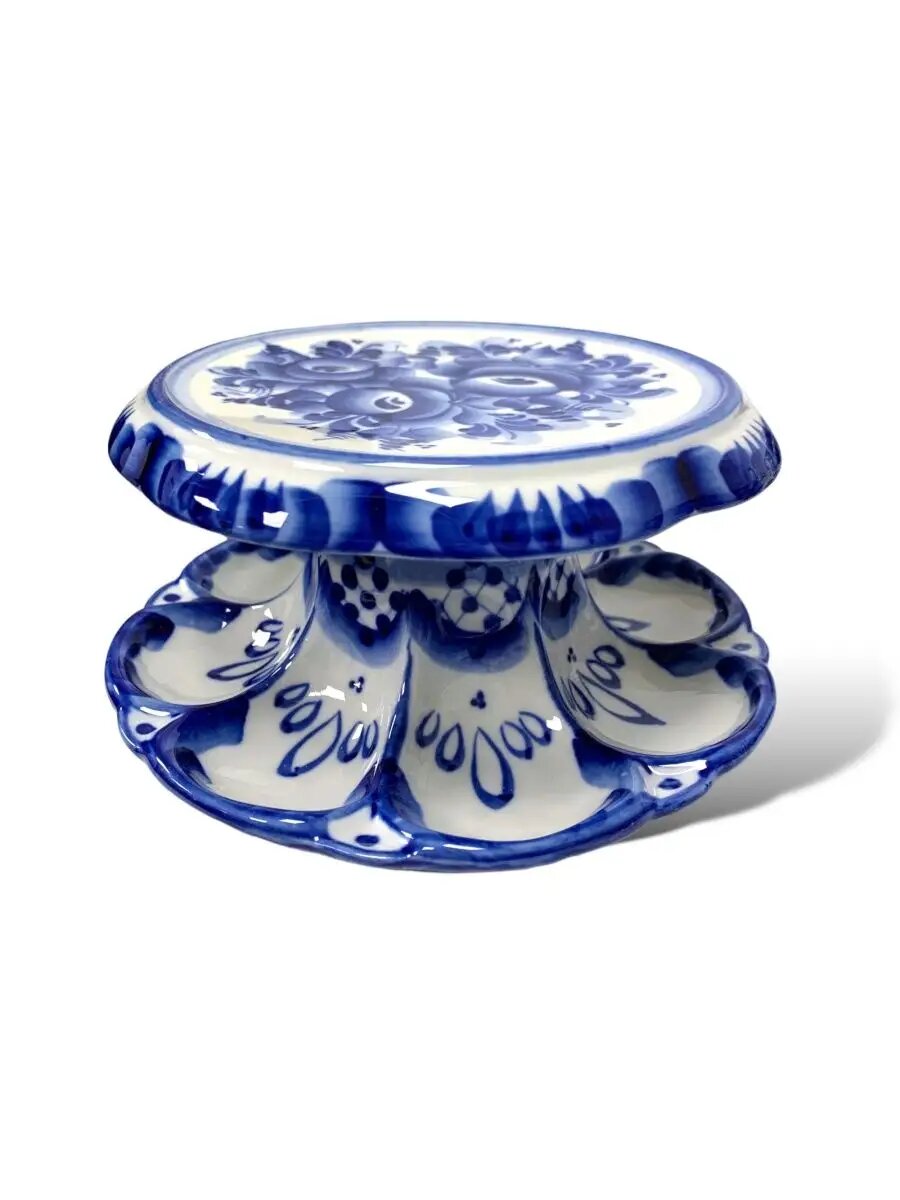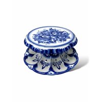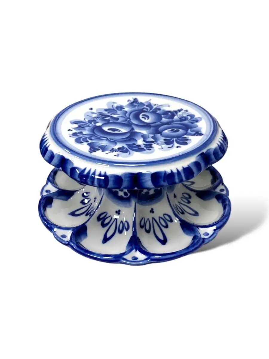 Для каждого с любовью выкрашенного хозяйкой яйца предусмотрена отдельная ячейка, расписанная полупрозрачными мазками синего кобальта и декорированная знаменитой гжельской сеточкой. На плоской поверхности пасхальницы поместится кулич диаметром до 17 см.