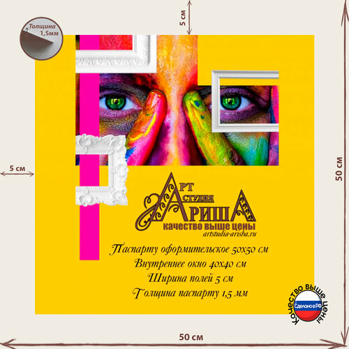 Паспарту арт: W101, 50х50 см, цвет белый (спокойный белый), цвет среза белый + планшет (задник) серый. Внутреннее окно 40х40 см. Ширина полей 5 см. Толщина паспарту с планшетом 1,5 мм. У нас большой выбор оттенков паспарту и абсолютно все размеры в том числе и нестандартные размеры на витрине. Не нашли нужный Вам размер – напишите нам в чате, отправим ссылку на товар с нужным Вам размером. Паспарту всех размеров всегда есть в наличии. Паспарту для картин - незаменимая вещь, она поможет вам легче подобрать размер рамки. Важно помнить, что паспарту отводится лишь роль связующего звена картины и рамы. Паспарту для рисунка - это рамка для картины из картона, куда вставляется произведение. В паспарту уместно вставить детские рисунки или работы для выставки. Наши паспарту подойдут для создания уникального дизайна, благодаря большому количеству цветов. Рамка для фото с паспарту - отличный вариант, отмеченный многими дизайнерами интерьеров и просто любителями уюта. Цвет товара может отличатся от реального цвета товара, в связи с особенностью настройки цветопередачи Вашего монитора.