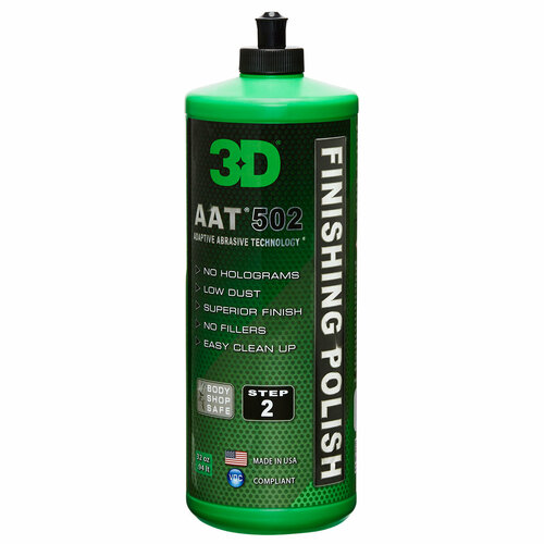 Финишная антиголограммная полироль AAT 502 FINISHING POLISH 3D на водной основе с нано-абразивными частицами оксида алюминия, для быстрой полировки любых типов ЛКП. Эффективно удаляет средние и лёгкие царапины на ЛКП без пыли, имеет малый расход. Неразрушаемый абразив. Легко корректируют практически любую окрашенную поверхность, не оставляя разводов и голограмм. Обеспечивает зеркальную гладкость без добавления филлеров (что позволяет избежать возможного потускнения ЛКП). Мультиповерхностный выравнивающий агент ускоряет процесс и усиливает эффект. Автомобильное покрытие станет гладким как стекло.