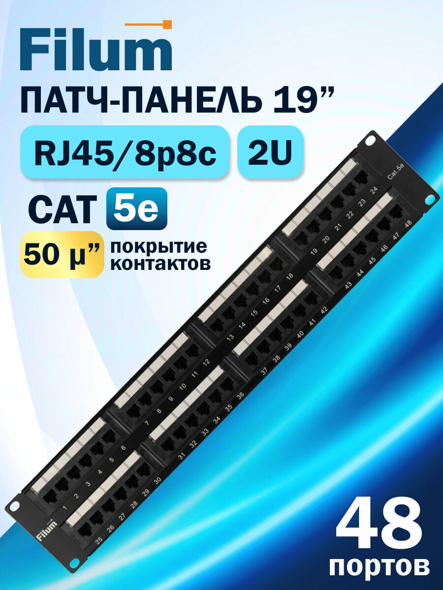 Патч-панель Filum FL-PP-5E48U2 19″, 2U, Cat 5e, 48 портов RJ45 (8p8c), неэкранированная, Dual IDC (110/KRONE): сравнение цен, характеристики, фото, актуальное наличие и цены.