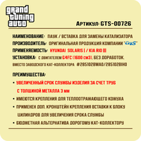Длительная эксплуатация с неисправным катализатором может привести к серьезным поломкам двигателя. В случае разрушения части, наполняющей катализатор, частицы наполнителя могут попасть в цилиндр двигателя. Оригинальный продукт GTS изготовлен из высококачественной конструкционной углеродистой стали 08ПС, который идеально заменит оригинальный выпускной коллектор с номером заводской детали #285102BWA0/285102BIH0 для автомобилей Hyundai Solaris 1 / KIA Rio 3 с двигателем G4FC (объемом 1,6 литра). Вставка предназначена для замены вышедшего из строя катализатора.