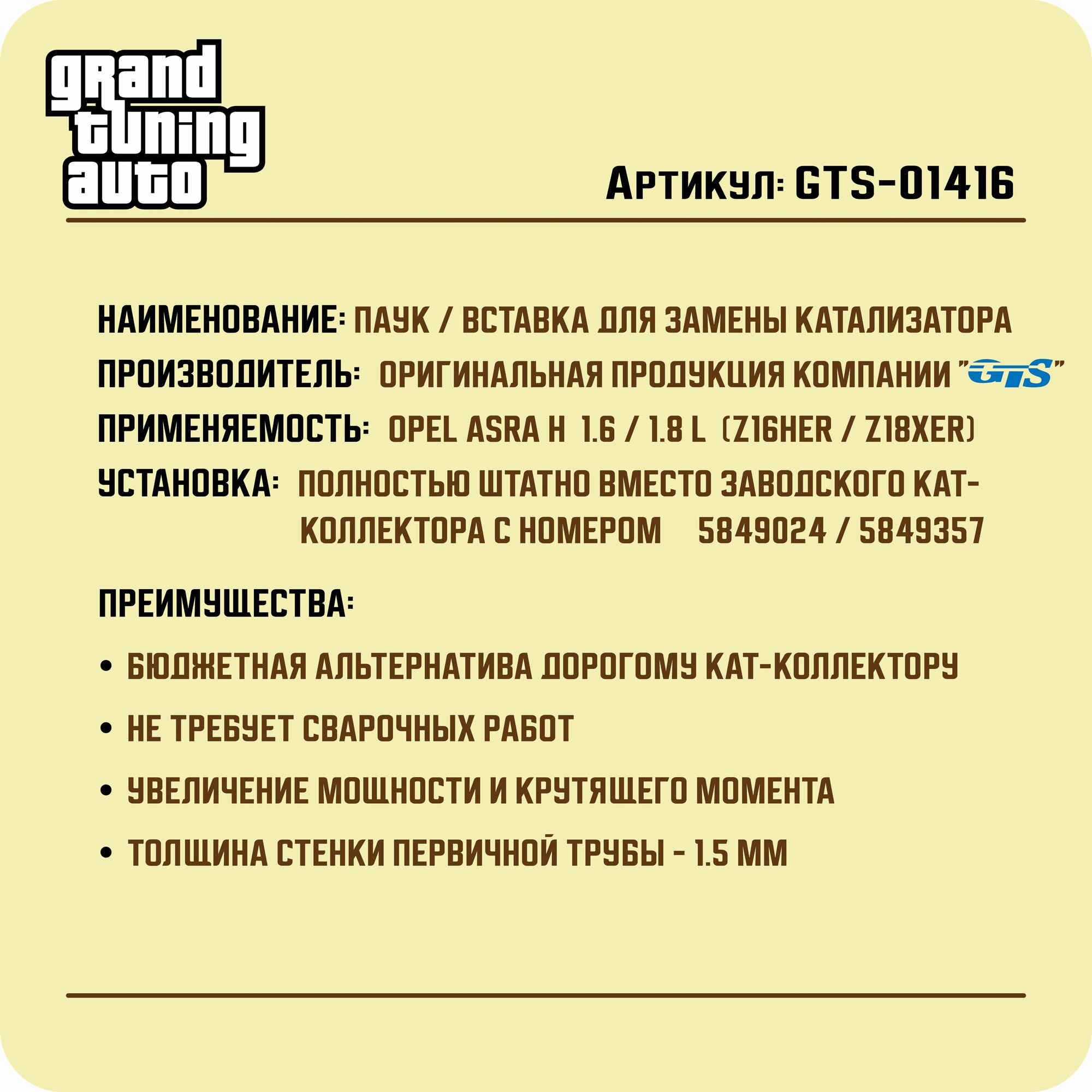 Оригинальный продукт GTS изготовлен из высококачественной конструкционной углеродистой стали 08ПС, который идеально заменит оригинальный выпускной коллектор с номером заводской детали 5849024/5849357 для а/м Opel Astra H 1.6/1.8L и двигателем Z16XER/Z18XER. Вставка предназначена для замены вышедшего из строя катализатора.