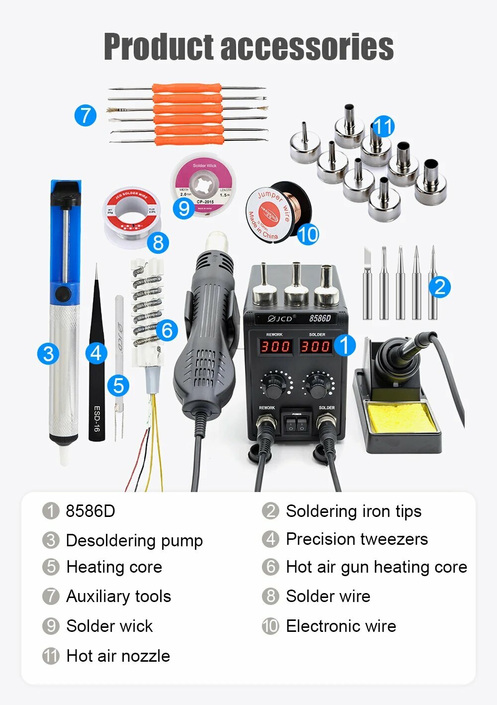 Паяльная станция JCD 8586D, станция 2 в 1 со стандартным цифровым дисплеем и термофеном для сварки сотовых телефонов, инструменты для удаления припоя, 8586D KIT5, 220V: сравнение цен, характеристики, фото, актуальное наличие и цены.