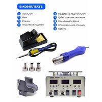 Параметры: - Питание: АС 220В ± 10%, 50-60Гц - Мощность фена: 480Вт - Мощность паяльника: 90Вт - Мощность станка: 600Вт - Тип фена: турбина - Скорость потока воздуха: 120л/мин