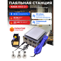 Паяльная станция KADA 9803D+ - это многофункциональное устройство, которое сочетает в себе полноценную термовоздушную паяльную станцию фен+паяльник и станок для разборки сенсорных модулей с вакуумной присоской. Станция оснащена нагревателем с длительным сроком службы и микроконтроллером для управления температурой.