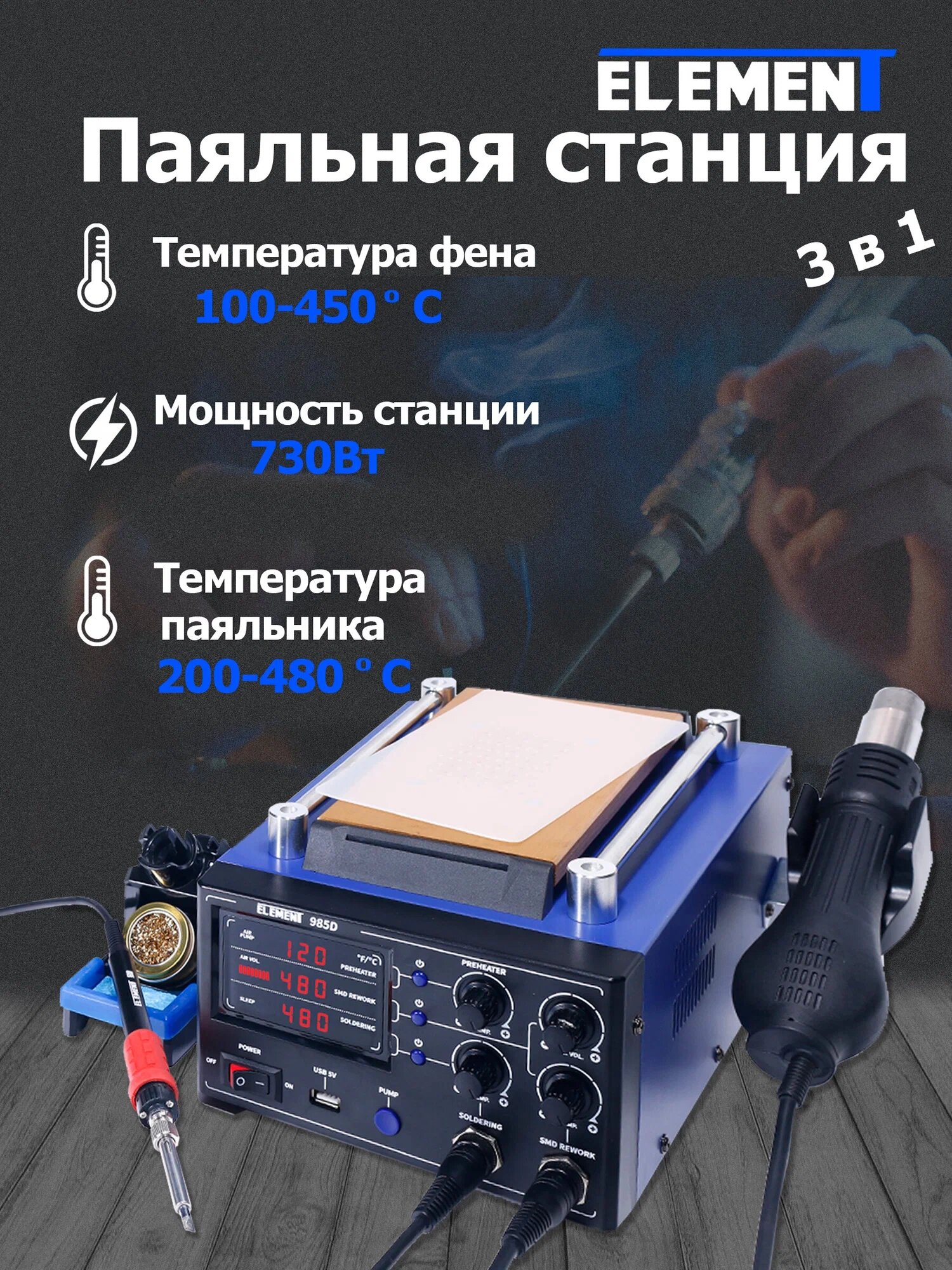 Купить Паяльная станция (контактная) ELEMENT 985D (3-в-1), паяльник, термофен и вакуумный сепаратор с доставкой по всей России. Паяльная станция (контактная) ELEMENT 985D (3-в-1), паяльник, термофен и вакуумный сепаратор: сравнение цен, характеристики, фото, актуальное наличие и цены.