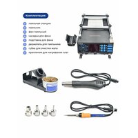 Паяльная станция W.E.P 853AAA 1270 Вт - это многофункциональное устройство, которое сочетает в себе полноценную термовоздушную паяльную станцию фен+паяльник и нагреватель плат. Станция паяльная мощностью 1270 Вт - строительный инструмент для пайки, ремонта электроники, мобильных телефонов, бамперов автомобилей, термоусадочных работ, ручной установки радиоэлементов, монтажа, демонтажа электронных компонентов. Электрический паяльник с керамическим нагревателем (t 200-480С), турбинный фен (t 100-480C), нагреватель плат (t 50-300C) подойдет как для домашнего, так и для профессионального использования. Широкий диапазон рабочих температур позволят применять данное устройство в самых разнообразных условиях. Благодаря подставке для электропаяльника, губке и держателю для фена можно осуществлять безопасную работу без соприкосновения паяльника/термофена со столом и случайных ожогов. Пластиковая рукоятка со специальным прорезиненным покрытием, 2 дисплея индикации t. Набор для пайки имеет 4 насадки на фен различного диаметра, можно использовать удобные сменные жала для паяльника, что обеспечивает универсальность применения данного оборудования. Станция обеспечивает возможность регулировки и поддержки заданной температуры, терморегуляция. Керамический нагревательный элемент паяльника позволяет избежать поражения электронных компонентов напряжением, которое могло бы образоваться на жале при использовании обычного (металлического) нагревательного элемента. Удобная конструкция позволяет поменять, в случае необходимости, жало без проблем и лишних усилий.