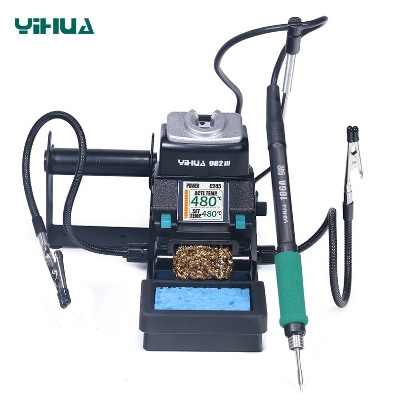 Купить Паяльная станция YIHUA 982-III — сменные наконечники 30 Вт (C115) и 40 Вт (C210), диапазон 90–450 гр. C, LCD-дисплей, PID-контроль, держатели платы, автоотключение с доставкой по всей России.