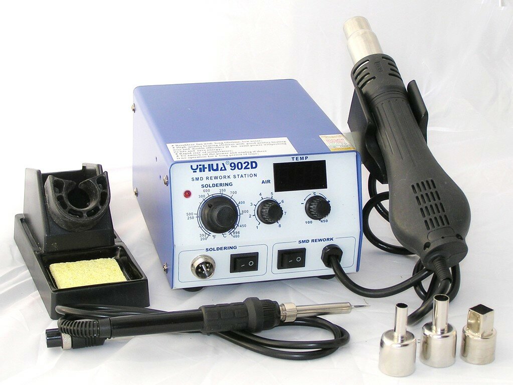 Паяльная станция Yihua YH 902 D термовоздушная с паяльником. Применяется для демонтажа и пайки различных видов компонентов в корпусах, таких, как SOIC, PLCC, QFP, BGA.