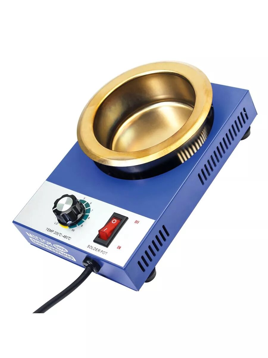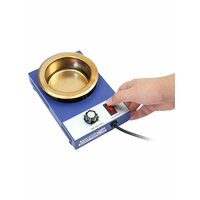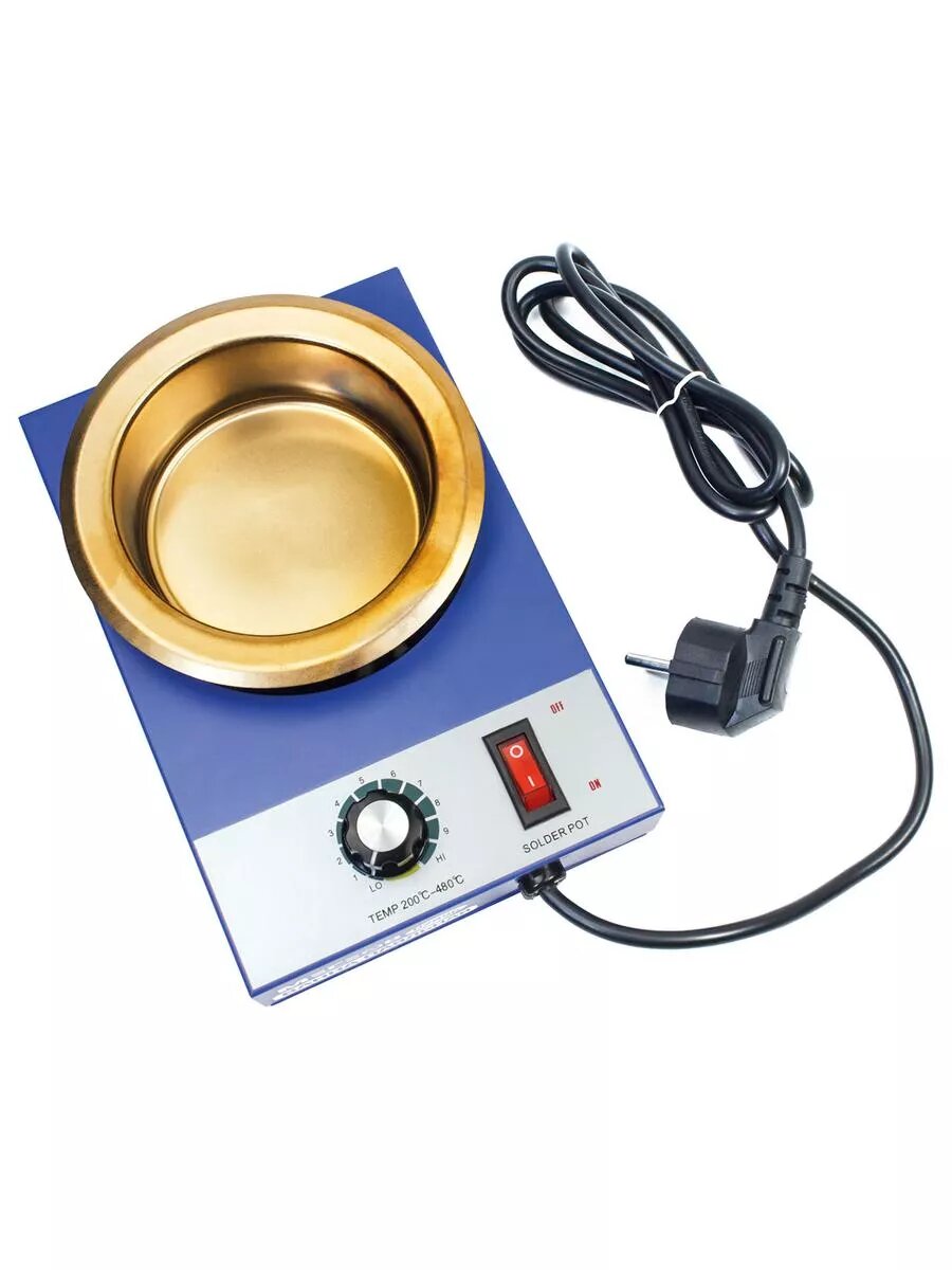 номинальная мощность 300 Вт; диапазон температур 200 - 480 °С; максимальная масса припоя 2200 г; размер тигля (диаметр х глубина) 100х40 мм; тигель из нержавеющей стали; пригоден для бессвинцовых припоев