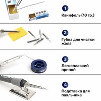 | Комплектация | Паяльник 60 Вт — 1 шт. Чехол тканевый — 1 шт. Экстрактор припоя (оловоотсос) — 1 шт. Припой — 1 шт. Пинцет антистатичсекий — 1 шт. Комплект дополнительных сменных жал типа 900М — 5 шт. Подставка для пайки — 1 шт. Губка для чистки паяльника — 1 шт. |