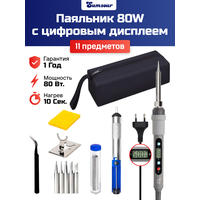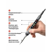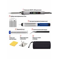 Электрический паяльник 80 вт. с цифровой регулировкой температуры и керамическим нагревательным элементом. Паяльный набор подойдёт как для тех, кто только знакомится с пайкой, так и для настоящих профессионалов. Данную модель отличает ЖК-Дисплей, который отображает температуру нагрева. Электрический паяльник имеет кнопку включения и отключения питания. Регулировка температуры происходит с помощью кнопок.