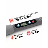 Паяльник имеет мощность 80Вт и позволяет регулировать рабочую температуру в пределах от 180 °C до 500 °C. Важно: Для включения необходимо удерживать красную кнопку в течение 3 секунд.