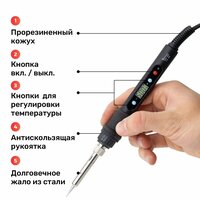 | Комплектация | Паяльник 60 Вт — 1 шт. Чехол тканевый — 1 шт. Экстрактор припоя (оловоотсос) — 1 шт. Припой — 1 шт. Пинцет антистатичсекий — 1 шт. Комплект дополнительных сменных жал типа 900М — 5 шт. Подставка для пайки — 1 шт. Губка для чистки паяльника — 1 шт. |