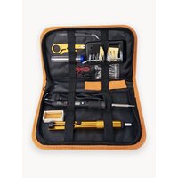 Электрический паяльник с цифровой регулировкой температуры и керамическим нагревательным элементом. Данную модель отличает ЖК-Дисплей, который отображает температуру нагрева. Регулировка температуры происходит с помощью кнопок. Также паяльник имеет кнопку отключения и включения питания. Важно: Для включения необходимо удерживать красную кнопку в течение 3 секунд. Паяльный набор подойдёт как для тех, кто только знакомится с пайкой, так и для настоящих профессионалов. Паяльник имеет мощность 80Вт и позволяет регулировать рабочую температуру в пределах от 180°C до 500 °C. Набор для пайки содержит все необходимые принадлежности: Электрический паяльник 80 Вт Кейс для хранения Припой для пайки Канифоль для пайки 5 Сменных стальных жал типа 900М Губка для очистки жала паяльника Подставка для пайки Антистатический пинцет Экстрактор припоя (оловоотсос) Черный и красный AWG провода Нож для снятия изоляции Особенности паяльника Регулировка температуры 180°С - 500°С Кнопка отключения питания Мощность 80Вт Быстрый нагрев до рабочей температуры Керамический нагреватель Рабочее напряжение: 220В Вилка европейского стандарта